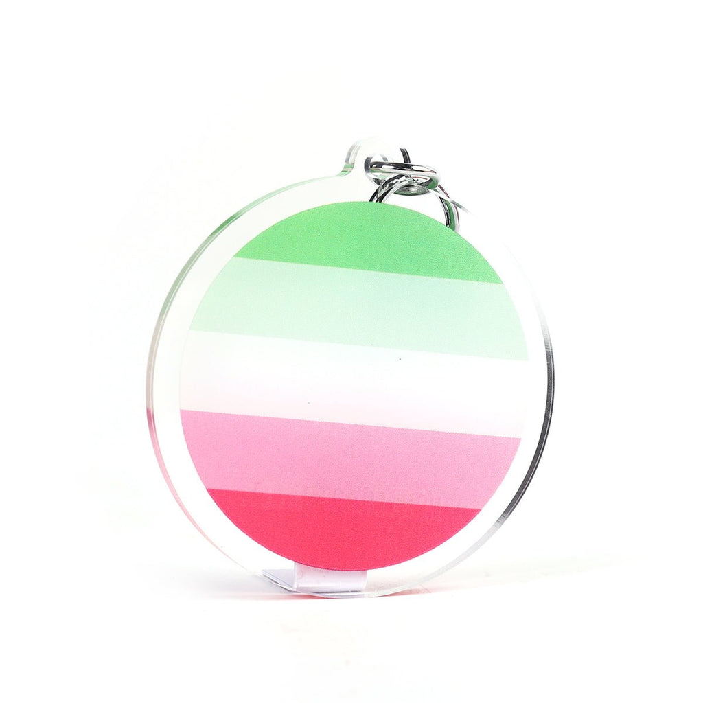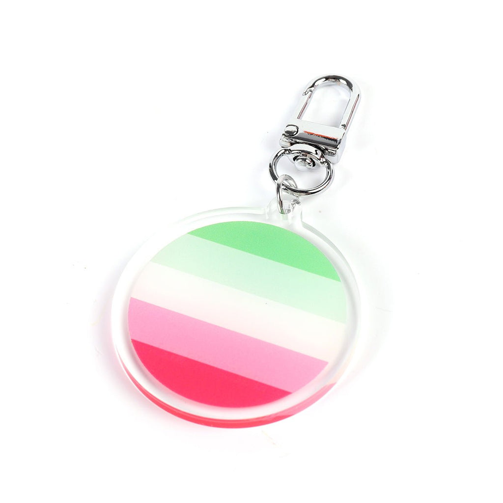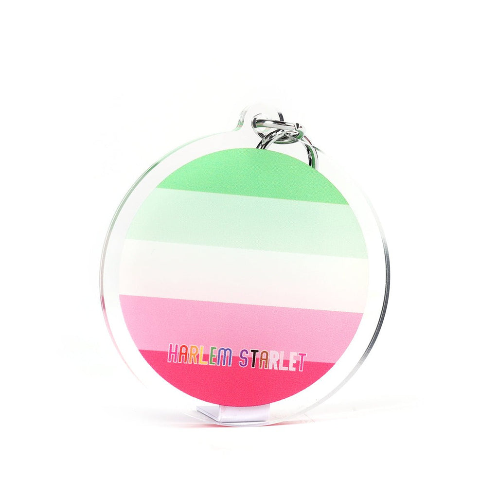 This keyring features a circular Abrosexual Flag design in Green, White and Pink stripes with a clear edges. It measures 50mm x 50mm round and has a good sized, sturdy carabiner style metallic clip. The keyring is double sided and is a plain flag on one side, the reverse side has Harlem Starlet in the progress flag colours written down the bottom.