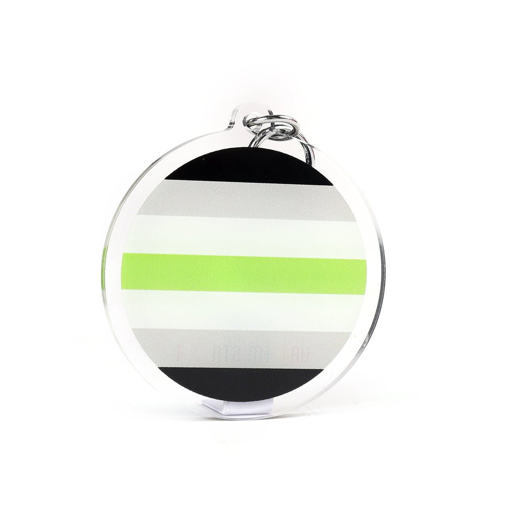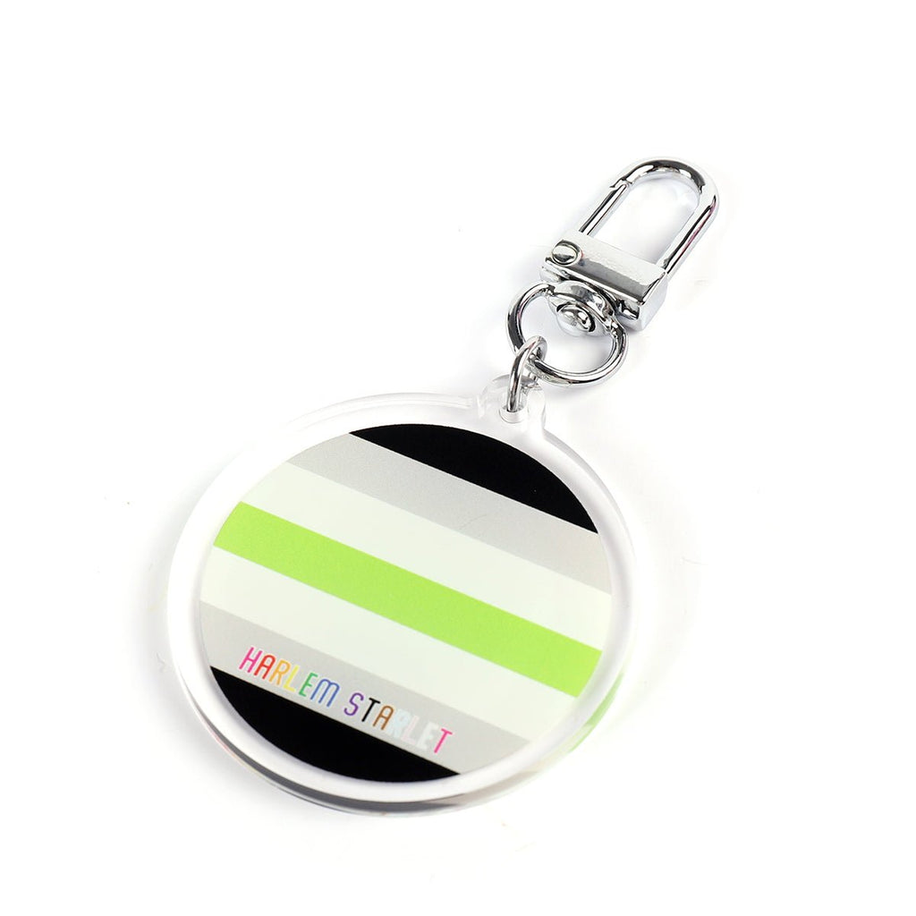This keyring features a circular Agender Flag design in Black, Grey, White & Green stripes with a clear edges. It measures 50mm x 50mm round and has a good sized, sturdy carabiner style metallic clip. The keyring is double sided and is a plain flag on one side, the reverse side has Harlem Starlet in the progress flag colours written down the bottom.