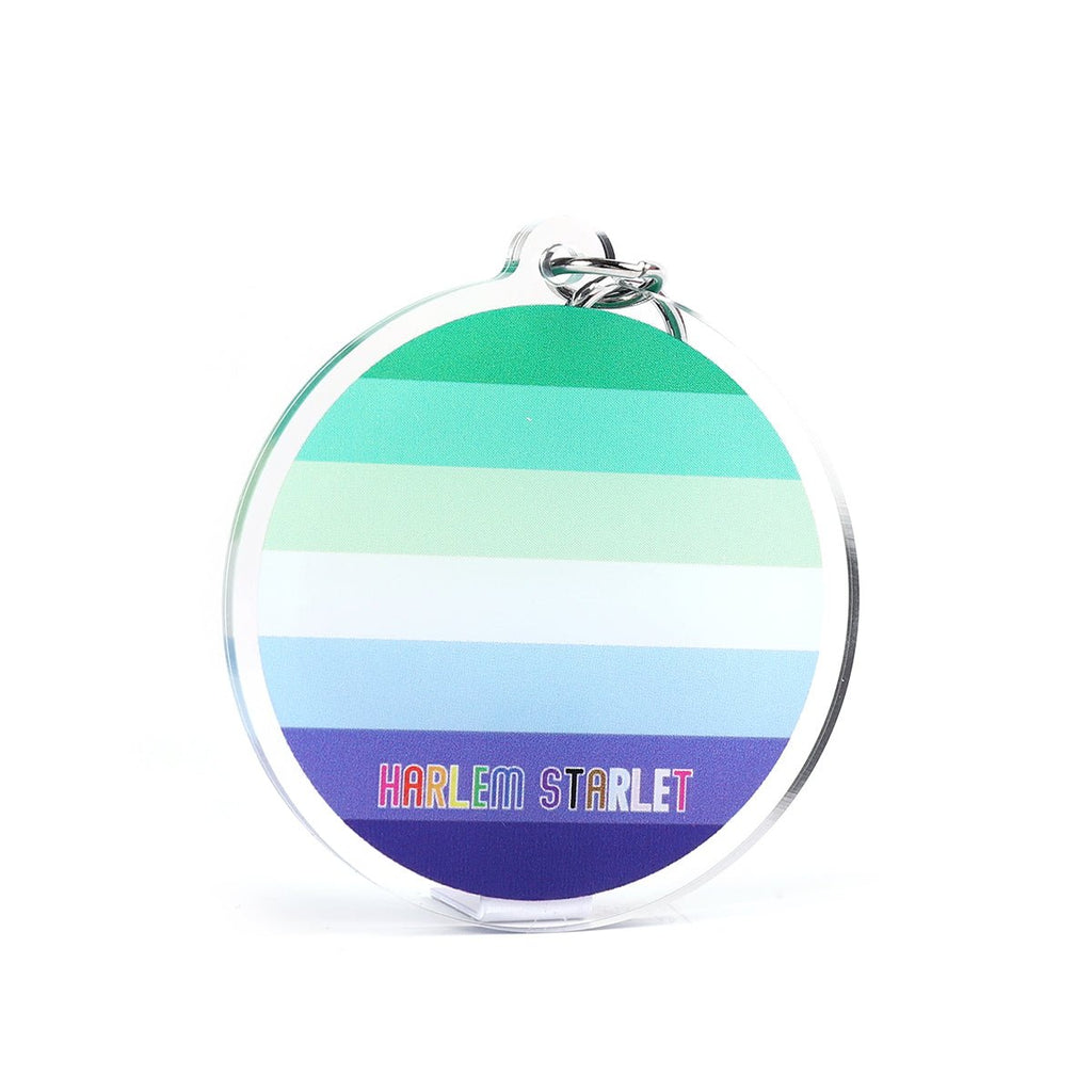 This keyring features a circular Gay Male Flag design in shades of Green, Blue and White stripes with a clear edges. It measures 50mm x 50mm round and has a good sized, sturdy carabiner style metallic clip. The keyring is double sided and is a plain flag on one side, the reverse side has Harlem Starlet in the progress flag colours written down the bottom.