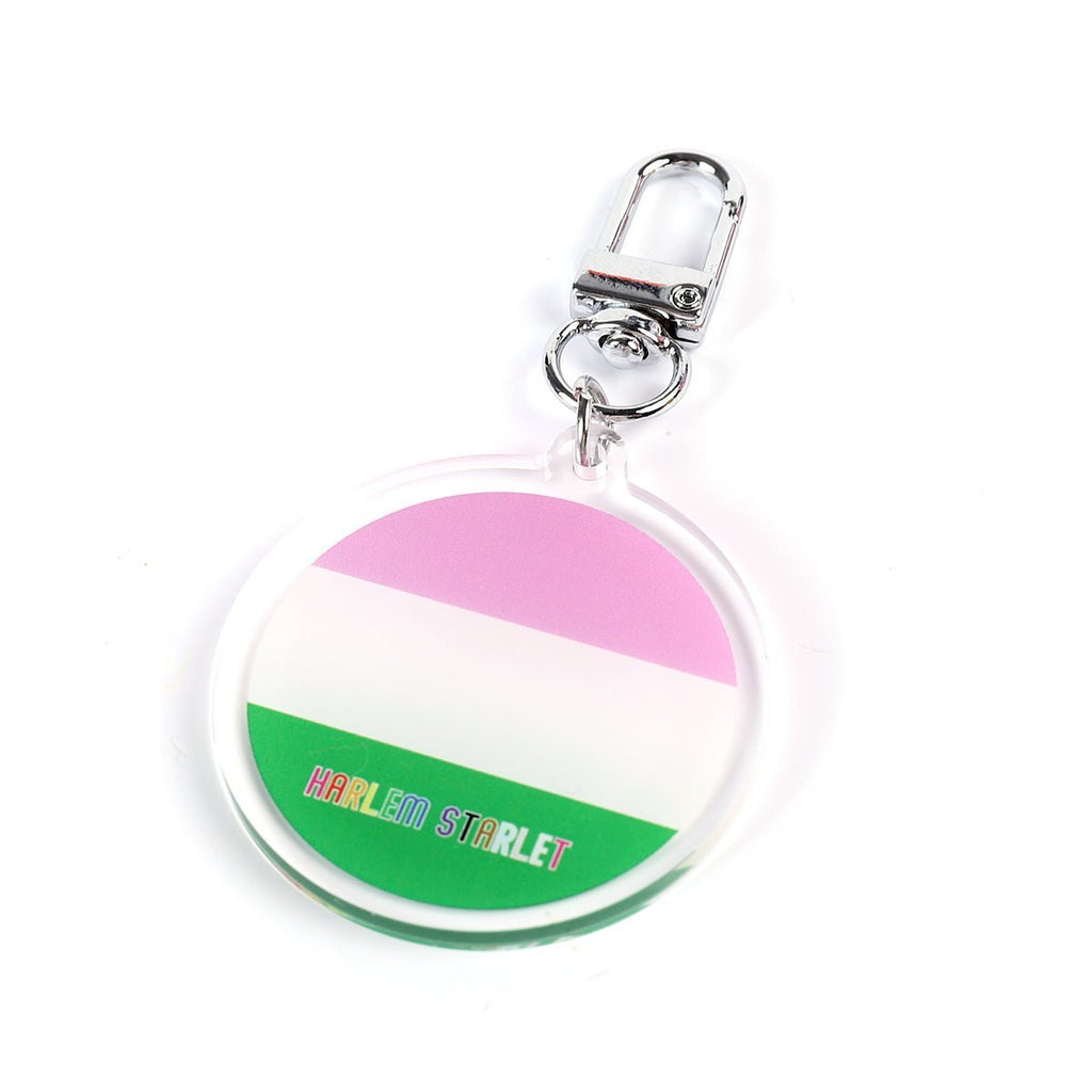 This keyring features a circular Genderqueer Flag design in Purple, White & Green stripes with a clear edges. It measures 50mm x 50mm round and has a good sized, sturdy carabiner style metallic clip. The keyring is double sided and is a plain flag on one side, the reverse side has Harlem Starlet in the progress flag colours written down the bottom.