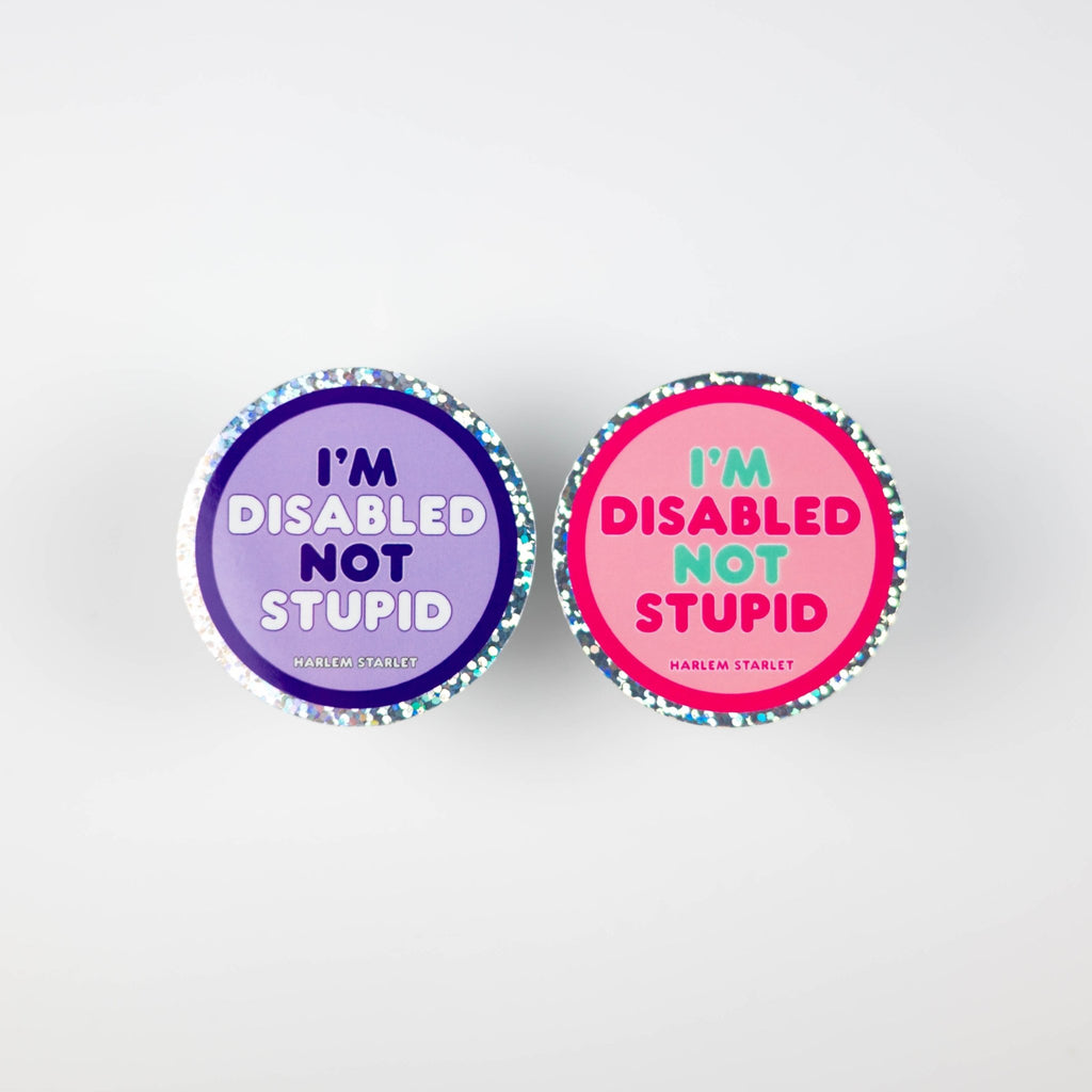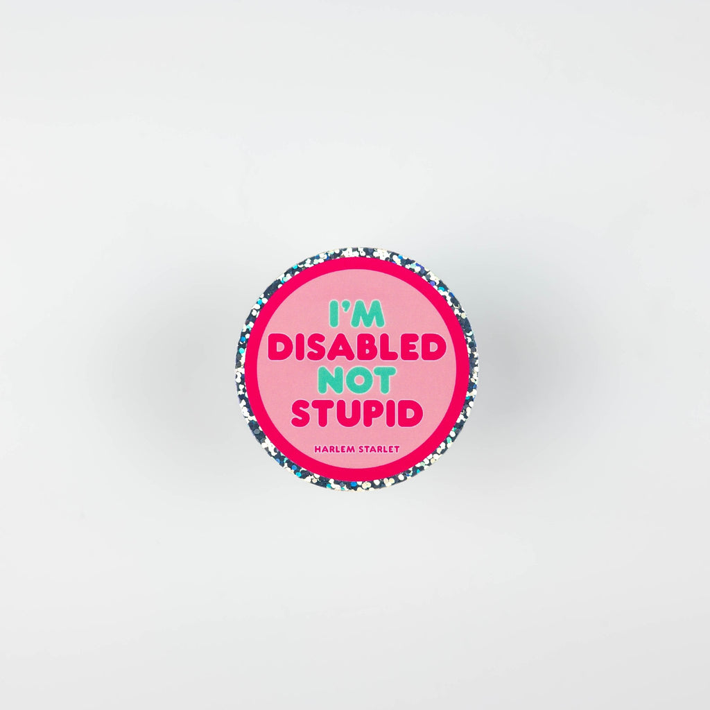 The I'm Disabled Not Stupid round holographic glitter statement sticker is created for bold personalities who embrace direct humour, strong identity and unapologetic self-expression. This funny slogan sticker turns everyday items into confident personality statements that reflect lived experience, emotional honesty and main-character energy.