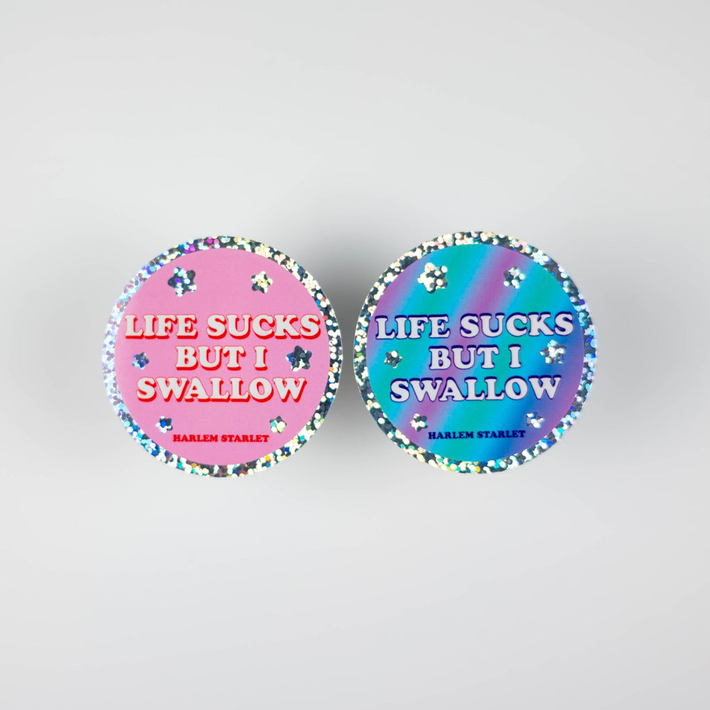 The Life Sucks But I Swallow glitter statement sticker is designed for expressive personalities, relatable dark humour and unapologetic everyday self-expression. Featuring a cheeky slogan inspired by chaotic inner monologues, this funny novelty sticker transforms daily essentials into playful personality statements.