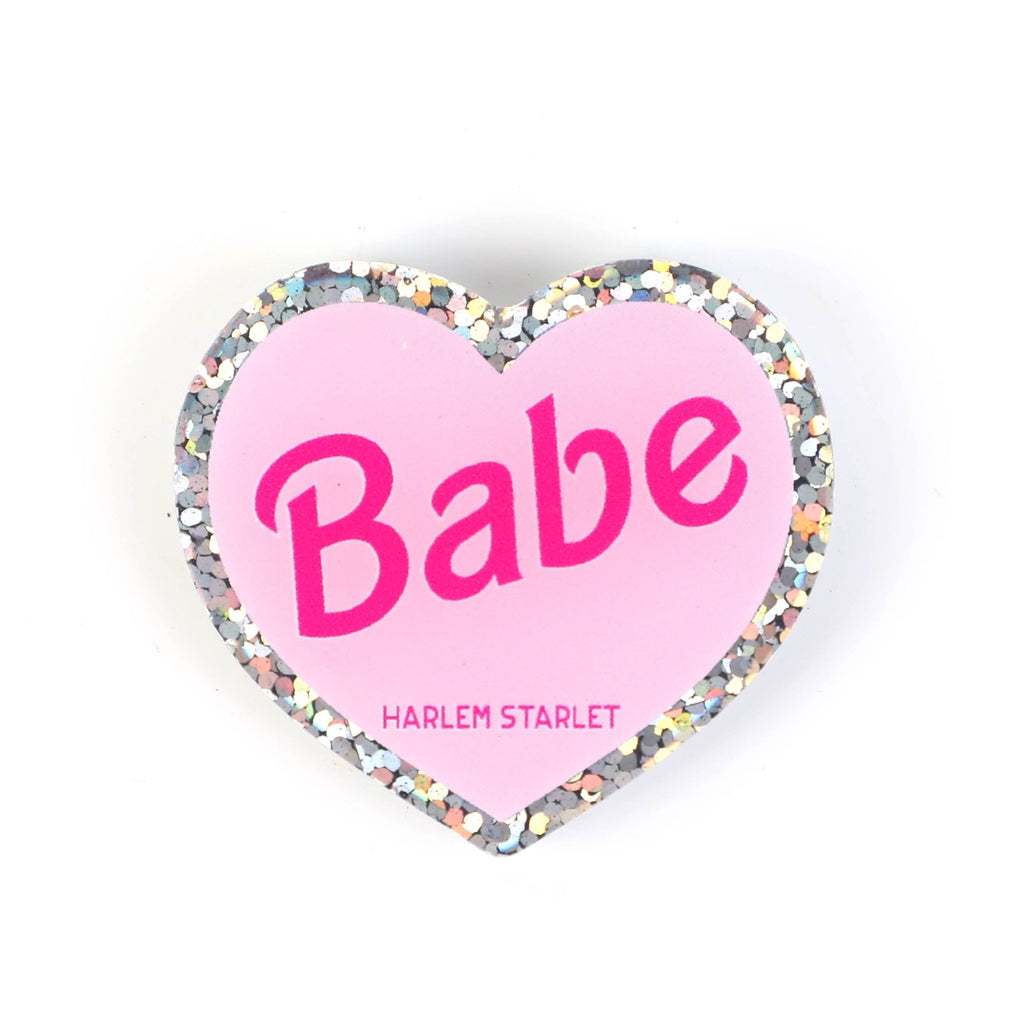 This pin features our original Babe design in Pink with silver sparkle glitter backing and strong magnetic back closure for accessibility. This pin measures 38mm wide x 34mm high.