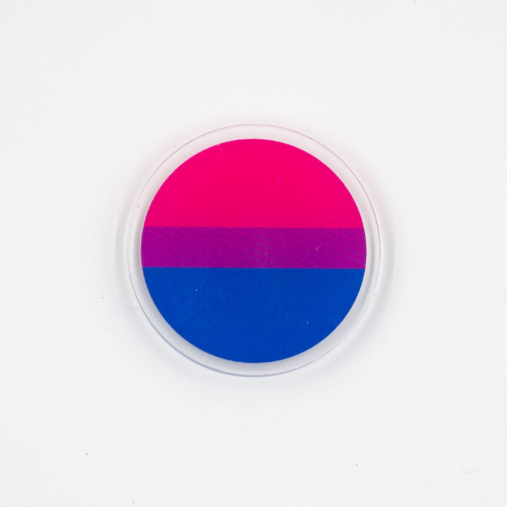 This pin features a circular Bisexual Flag design in Black, Grey, White & Purple stripes with a clear edges and a strong magnetic pin back for accessibility. This pin measures 38mm round. The pin has a double sided print and is a plain flag on the front side, the reverse side has Harlem Starlet in the progress flag colours written down the bottom.