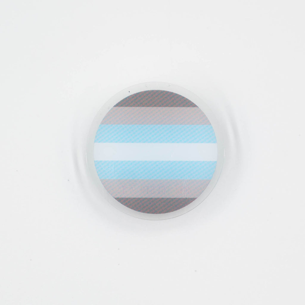 This pin features a circular Demiboy Flag design in Grey, Blue and White stripes with a clear edges and a strong magnetic pin back for accessibility. This pin measures 38mm round. The pin has a double sided print and is a plain flag on the front side, the reverse side has Harlem Starlet in the progress flag colours written down the bottom.