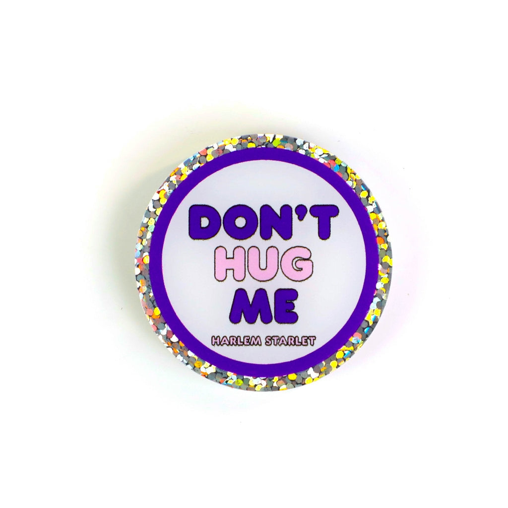 This pin features our original Don't Hug Me design in Purple with silver sparkle glitter backing and a strong magnetic pin back for accessibility. This pin measures 38mm round.