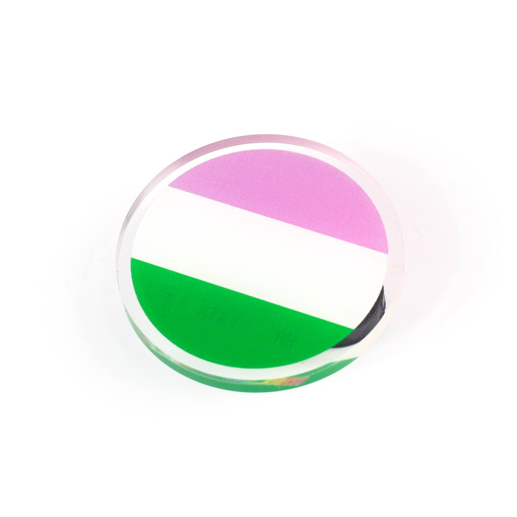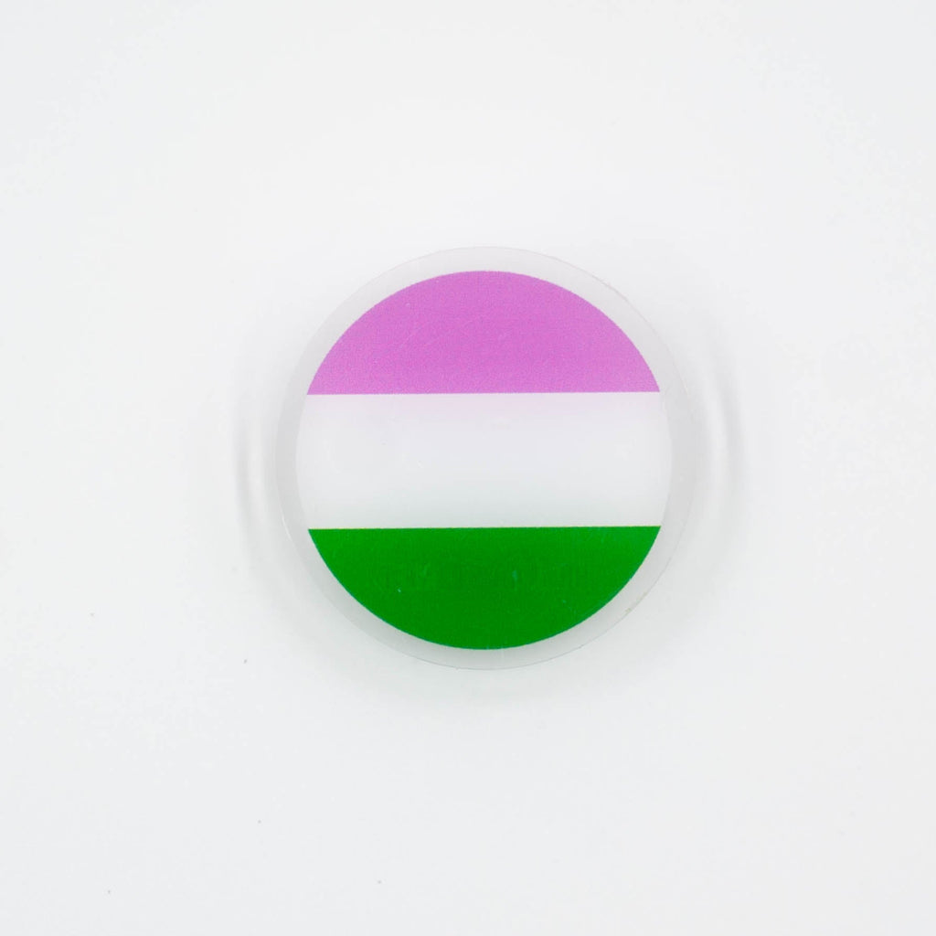 This pin features a circular Genderqueer Flag design in Purple, White & Green stripes with a clear edges and a strong magnetic pin back for accessibility. This pin measures 38mm round. The pin has a double sided print and is a plain flag on the front side, the reverse side has Harlem Starlet in the progress flag colours written down the bottom.