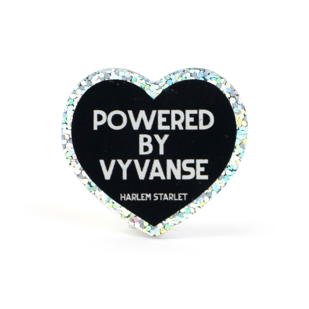 This pin features our original Powered by Vyvanse design in Black with silver sparkle glitter backing and a strong magnetic pin back for accessibility. This pin measures 38mm wide x 34mm high.