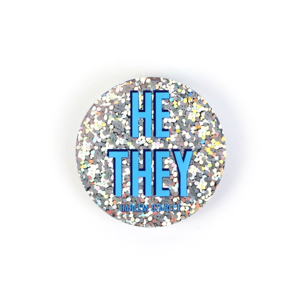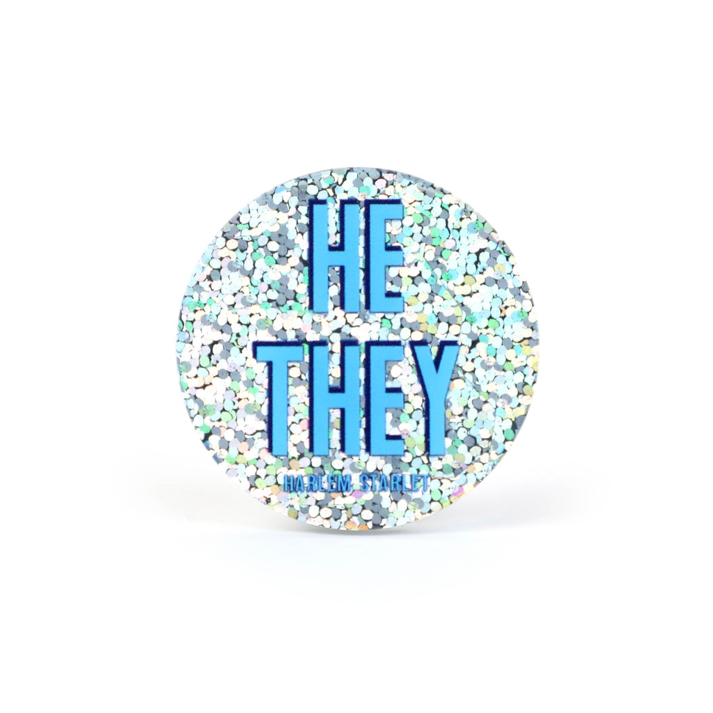 This pin features our original pronoun design with silver sparkle glitter backing and a strong magnetic pin back for accessibility. This pin measures 38mm round.