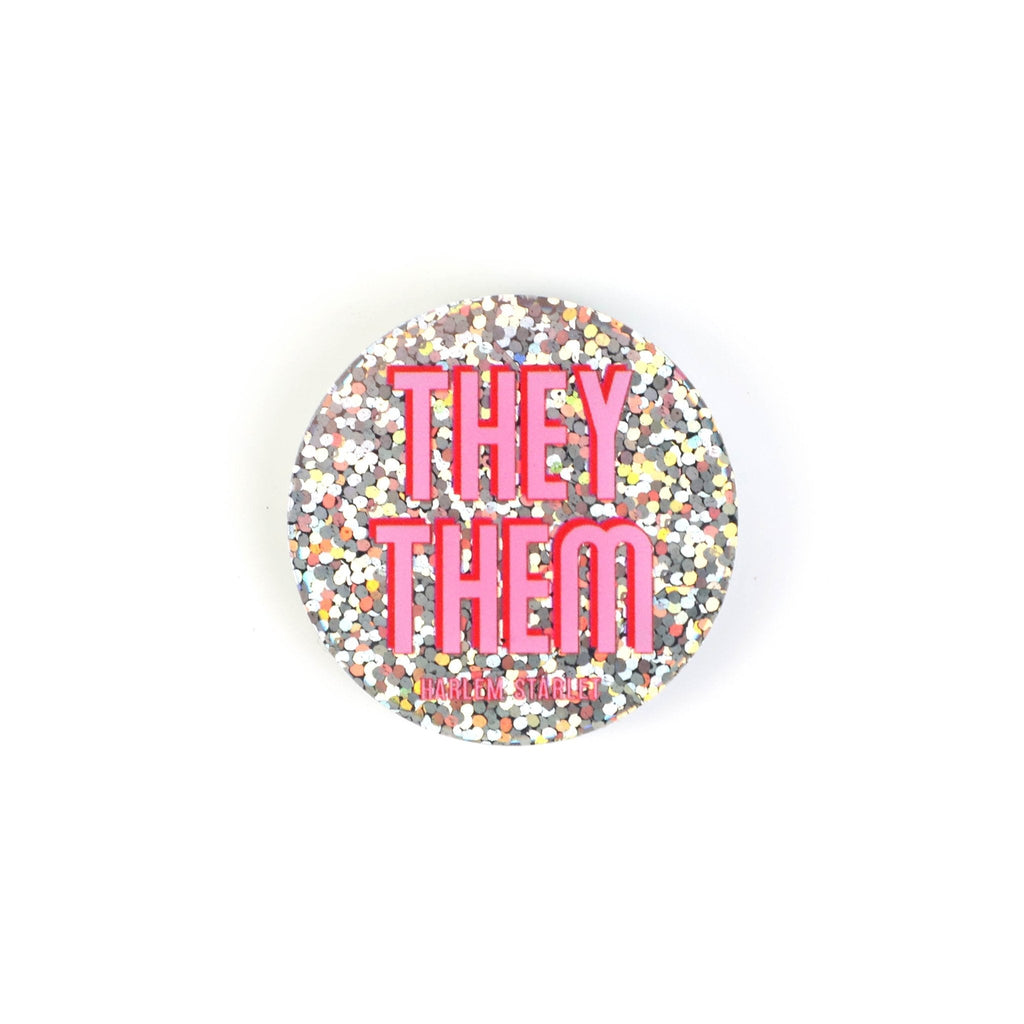 This pin features our original pronoun design with silver sparkle glitter backing and a strong magnetic pin back for accessibility. This pin measures 38mm round.