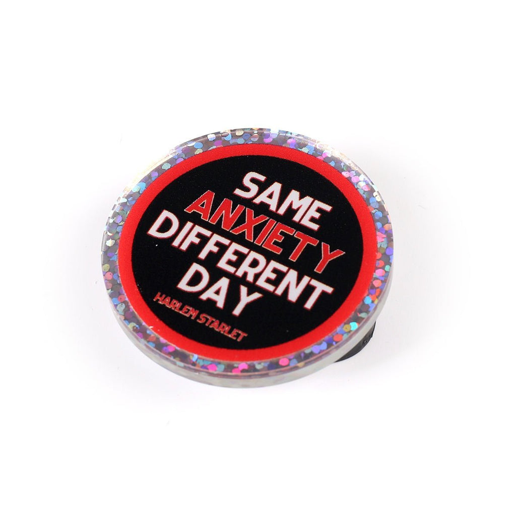 This pin features our original Same Anxiety, Different Day design in Black with silver sparkle glitter backing and a strong magnetic pin back for accessibility. This pin measures 38mm round.